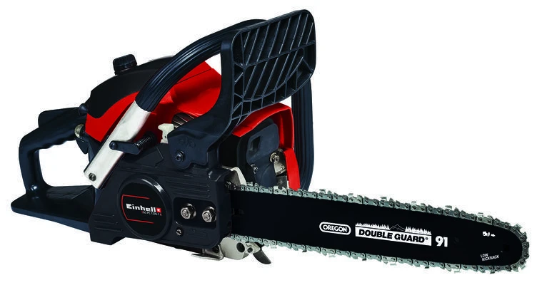 Die Einhell Benzin-Kettensäge GC-PC 1335/1 I ist eine leistungsstarke Kombination einer Einhell Benzin-Kettensäge mit der Schärfe eines OREGON-Qualitätsprodukts. Ausgerüstet mit einem ORGEON-Schwert mit -kette, steht der Heim- und Gartenarbeit nichts mehr im Weg. Zweige und Äste sowie Kanthölzer, Werkstücke und Brennholz haben der Benzin-Kettensäge kaum etwas entgegenzusetzen. Der luftgekühlte Zweitakt-Motor mit der beidseitig gelagerten Kurbelwelle bietet einen starken Antrieb. Einfach und sicher lässt sich die Benzin-Kettensäge durch eine Reihe technischer Unterstützungsfunktionen handhaben. Die Antivibration dämpft die Stöße beim Arbeiten ab – so werden die Kraftreserven des Anwenders geschont. Einen leichten Start ermöglichen die Kaltstarthilfen „Primer“ und Auto-Choke. Dank digitaler Zündung wird eine schnelle und dynamische Gasannahme gewährleistet und ein stabiler Motorlauf garantiert. Für die optimale Sicherheit des Benutzers sorgt der Rückschlagschutz mit Sofort-Kettenbremse. Dieser aktiviert sich unmittelbar beim Hochschlagen der Säge, so dass die Kette augenblicklich angehalten wird. Zusätzlich ist die Benzin-Kettensäge von Einhell mit einem Kettenfänger ausgerüstet, damit das Risiko auch beim Abspringen der Kette minimiert wird. Der große und robuste Krallenanschlag aus Metall sorgt für eine sichere und bequeme Führung bei allen Arbeiten. Die automatische Kettenschmierung versorgt die Kettensäge mit ausreichend Kettenöl. Schwert und Kette werden bei der Lagerung in dem mitgelieferten Schwertschutz sauber aufbewahrt. In der Lieferung enthalten ist eine Benzin-/Öl-Mischflasche.