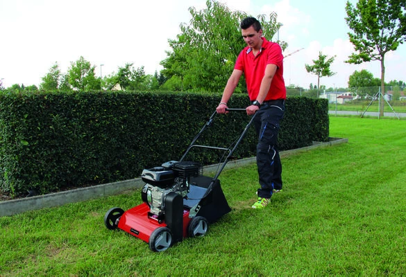 Der Benzin-Vertikutierer GC-SC 4240 P ist ein sehr leistungsstarkes und zuverlässiges Gerät, das ambitionierten Hobbygärtnern die fachgerechte Bodenbearbeitung für einen gesunden, unkrautfreien Rasen ermöglicht. Mit 18 hochwertigen Stahlmessern rückt die kugelgelagerte Messerwalze Unkraut und Moos samt Wurzel höchst effektiv zu Leibe. Dabei liefert der kraftvolle Viertakt-Benzinmotor reichlich Drehmoment für kontinuierlichen Arbeitsfortschritt mit einheitlich gutem Ergebnis. Die Drehzahlregelung ermöglicht ein ökonomisches Arbeiten. Dank zentraler Arbeitstiefeneinstellung in acht Stufen lässt sich der GC-SC 4240 P im Handumdrehen auf die Anforderungen von Boden und Bewuchs einrichten. Die Parkposition sorgt außerhalb des Rasens für den Schutz der Messer und des Untergrunds. Die großflächigen Räder des Benzin-Vertikutierers ermöglichen auch bei schwierigen Bodenverhältnissen müheloses Arbeiten und schonen den Rasen. Der Fangsack ist mit einem Volumen von 45 Litern sehr groß bemessen, um lange, unterbrechungsfreie Einsätze zu gestatten. Das Gerät verfügt über ein robustes, langlebiges Metall-Gehäuse und lässt sich dank klappbarem Führungsholm platzsparend unterbringen. Der GC-SC 4240 P wird für Rasenflächen bis ca. 1.200 m² empfohlen.