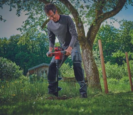 Der Einhell Professional Akku-Erdbohrer GP-EA 18/150 Li BL-Solo unterstützt Gartenbesitzer und Schrebergärtner als starker Helfer bei der Bepflanzung von jedem Garten und auch bei Arbeiten rund um das Garten-Beiwerk wie Zaunpfähle setzen, erdverbundene Dekorationen anbringen oder auch kreisrunde Fundamente ausheben. Geliefert wird das Akku-Gerät inklusive Erdbohrer-Aufsatz (80cm Länge / 15cm Durchmesser). Der Akku-Erdbohrer ist ein Mitglied der Power X-Change-Familie von Einhell, die Akkus mit den hochwertigen Lithium-Ionen Akkuzellen können mit allen Systemgeräten der Reihe kombiniert werden. Akku und Ladegerät sind nicht im Lieferumfang enthalten, diese sind separat erhältlich. Zum Betrieb des Erdbohrers ist ein PXC 18 Volt-Akku nötig. Angetrieben wird das Gerät von dem Einhell PurePOWER Brushless Motor. Dieser bürstenlose Motor bietet mehr Kraft und eine längere Laufzeit als herkömmliche Kohlebürsten-Motoren. Nach einer Online-Registrierung gelten 10 Jahre Garantie auf den Brushless-Motor. Der bürstenlose Motor treibt das Gewinde in die Erde, wobei er die Leistung optimal auf den Erdbohrer umsetzt. Zudem ist das Akku-Gerät mit einem robusten Aluminium-Getriebegehäuse ausgerüstet. Der Erdbohrer ist auf drei verschiedenen Modi einstellbar: 1) Linkslauf, um den Bohrer zu lösen 2) Rechtslauf im ECO Power-Modus. Reguläre Krafteinstellung für leichte Bohraufgaben in weichem Untergrund & 3) Rechtslauf im HIGH Power-Modus. Maximale Krafteinstellung bei hartem Untergrund. Eine maximale Stabilität und Verwindungssteifigkeit bietet der robuste Metallrahmen, die praktische Handhabung gewährt der Doppelhandgriff mit Softgrip für das ergonomische Arbeiten.