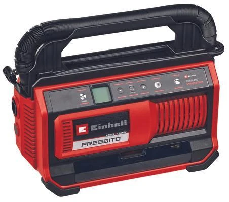 Die Luft ist raus? Nicht mit dem Einhell Akku-Kompressor PRESSITO 18/25: Als Teil der leistungsstarken Power X-Change Familie wird der Kompressor mit einem 18 Volt Power X-Change Akku betrieben. Seine Hochdruckpumpe erreicht bis zu 11 bar und eignet sich ideal für das Aufpumpen von Bällen, Fahrrad- und Autoreifen. Die Niederdruckpumpe sorgt für Luft in Luftmatratzen und Schwimmtieren für den Pool. Ablassen lässt sich die Luft im Anschluss mithilfe der Niederdruck-Saugoption. Auf der zweizeiligen LCD-Anzeige können Ist- sowie Soll-Druck in bar, psi oder kPa abgelesen werden. Ist der gewünschte Druck erreicht, schaltet sich die Pumpe automatisch ab. Ein Tastschalter zum Aufpumpen im Hochdruckbereich ohne Druckvoreinstellung vereinfacht die Handhabung zusätzlich. Das im Lieferumfang enthaltene 3-teilige Adapter-Set enthält eine Ballnadel, einen Reifenadapter und einen konischen Adapter. Die Adapter finden im praktischen, integrierten Aufbewahrungsfach im Kompressorgehäuse Platz. So gehen keine Einzelteile verloren. Auch der Hoch- sowie der Niederdruckschlauch lassen sich platzsparend in integrierten Fächern unterbringen. Ein praktischer Tragegriff und sein geringes Gewicht machen den Kompressor zum handlichen Begleiter für unterwegs und daheim. Die Lieferung erfolgt ohne Akku und Ladegerät. Diese sind separat erhältlich, zum Beispiel als praktisches Einhell-Starterset.