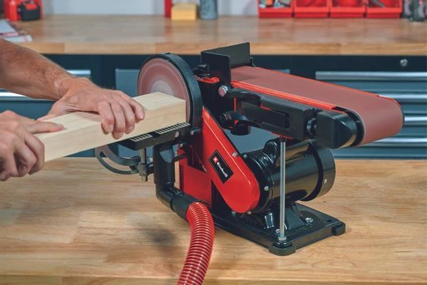 Der Einhell Stand-Band-Tellerschleifer TC-US 380 ist ein 380 Watt starker Helfer mit Band- und Tellerschleiffunktion und verfügt über eine schwenkbare Bandschleifeinrichtung mit Werkstückanschlag. Einen leichten und unkomplizierten Schleifbandwechsel gewährt die Spanneinrichtung, die Schleifbandzentrierung kann von außen justiert werden. Der Tellerschleifer mit 150 mm Durchmesser ist mit Kletthaftung für einen schnellen Schleifbandwechsel ausgerüstet. Der neigbare Alu-Auflagetisch ist stabil und verwindungsfrei gefertigt, am Schleifteller Band verwendbar und mit einer leicht ablesbaren Winkelskala für die vielseitigen Verwendungsmöglichkeiten ausgerüstet. Auch der Queranschlag ist schwenkbar von -60° bis +60° Grad. Vier robuste Gummifüße dämpfen Vibrationen und sorgen für einen festen und sicheren Stand. Am Stand-Band-Tellerschleifer ist ein Anschluss für eine Staubabsaugung für einen sauberen Arbeitsplatz vorhanden. Die Lieferung erfolgt inklusive Schleifband und Tellerschleifpapier.
