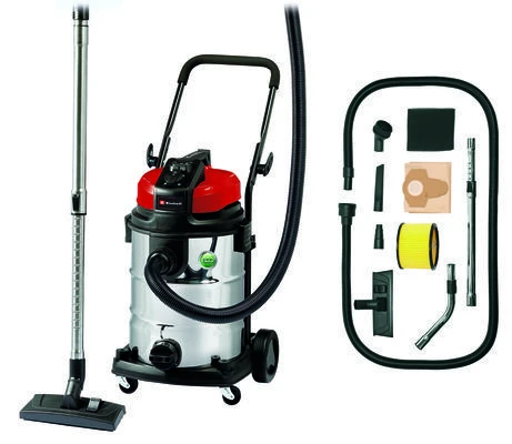 Der Einhell Nass-Trockensauger TE-VC 2230 SA reinigt im Gegensatz zu einem reinen Staubsauger und einem Wischmopp tief und gründlich. Damit ist ein Nass-Trockensauger die passende Ergänzung zu haushaltsüblichen Reinigungsgeräten bei starken, hartnäckigen und tiefen Verschmutzungen. Auch ambitionierten Heimwerkern ist ein Nass-Trockensauger bei Reinigungsaufgaben am Bau, in der Werkstatt oder im Hobbykeller ein praktischer Helfer. Das Innere aller Arten von Kraftfahrzeugen kann mit einem Nass-Trockensauger bis in die Textilspitzen gereinigt werden, Sitze und Himmel gleichermaßen wie die Teppiche und die Verkleidung. Der Einhell Nass-Trockensauger ist als ECO Staubsauger für hohe Saugleistung bei geringem Stromverbrauch konzipiert und setzt 1.150 Watt um. Der rostfreie Edelstahlbehälter fasst 30 Liter und ermöglicht damit ausdauernde Einsätze. Der Fehlluftregler ist einfach zu erreichen am Handgriff. Ein Blasanschluss zum Ausblasen von schwer zugänglichen Stellen ist integriert. Große Räder und Rollen gewähren einen einfachen Transport und Mobilität. Am Gehäuse integriert ist eine automatische Gerätesteckdose zum Betrieb von Elektrowerkzeugen. Ebenso vorhanden ist eine praktische Zubehörhalterung zum sauberen Verstauen des mitgelieferten Zubehörs. Das 500 Zentimeter lange Stromkabel kann am Trolley-Griff aufgewickelt werden. Eine einfache Reinigung des Nass-Trockensaugers gelingt durch die Wasserablassschraube zum Ablassen des aufgesaugten Wassers. Im Lieferumfang enthalten sind ein Teleskoprohr aus Edelstahl (Ø 36 mm), ein extra langer Plastiksaugschlauch (Ø 36 mm) mit 3 Metern Länge, eine große Kombidüse für Teppich- und Glattböden, Fugen- und Polsterdüse sowie Schaumstofffilter, Faltenfilter und Papierschmutzfangsack.