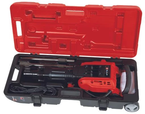 Mit dem Einhell Abbruchhammer TP-DH 50 ist selbst bei schweren Abbrucharbeiten „Selbermachen“ das Gebot der Stunde für den ambitionierten Heimwerker. Mit einer Schlagzahl von 1.800 pro Minute und Dank einer Einzelschlagstärke von 50 Joule des kraftvollen 1.700 Watt-Motors ist höchste Abbruchleistung in Haus und Garten garantiert, und das bei vibrationsarmem Arbeiten durch den schwingungsgedämpften Hauptgriff. Die SDS-Hex-Werkzeugaufname (33 Millimeter) ermöglicht einen schnellen und problemlosen Werkzeugwechsel. Der Zusatzhandgriff des TP-DH 50 ist so konzipiert, dass er sich um 180 Grad in vertikaler sowie um 360 Grad in horizontaler Richtung verstellen lässt und sich der Abbruchhammer so flexibel an jede Arbeitsposition anpasst. Das vier Meter lange und robuste Gummikabel erlaubt dabei größtmögliche Mobilität. Automatisch abschaltende Kohlebürsten verhindern überdies Gerätedefekte und bieten dem TP-DH 50 zusätzlichen Schutz. Der Abbruchhammer ist durch eine robuste und langlebige Konstruktion und damit auch für anspruchsvollen Dauerbetrieb ausgelegt. Sofort einsatzbereit ist der Abbruchhammer durch die mitgelieferten Spitz- und Flachmeißel. Der Softstart garantiert dabei eine sichere Bedienung. In der Lieferung enthalten ist ein praktisches Maschinentuch zur einfachen Reinigung des Geräts. Die Lieferung erfolgt in einem praktischen Transport- und Aufbewahrungstrolley.